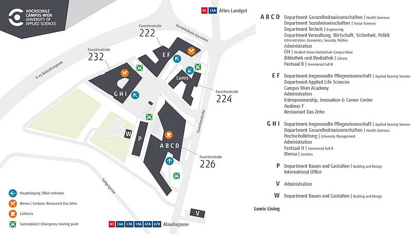 Den Veranstaltungsort Hochschule Campus Wien, Favoritenstraße 232, 1100 Wien, erreichen Sie öffentlich mit der U1 (Station Altes Landgut) oder mit der Linie 15A (Station Altes Landgut).